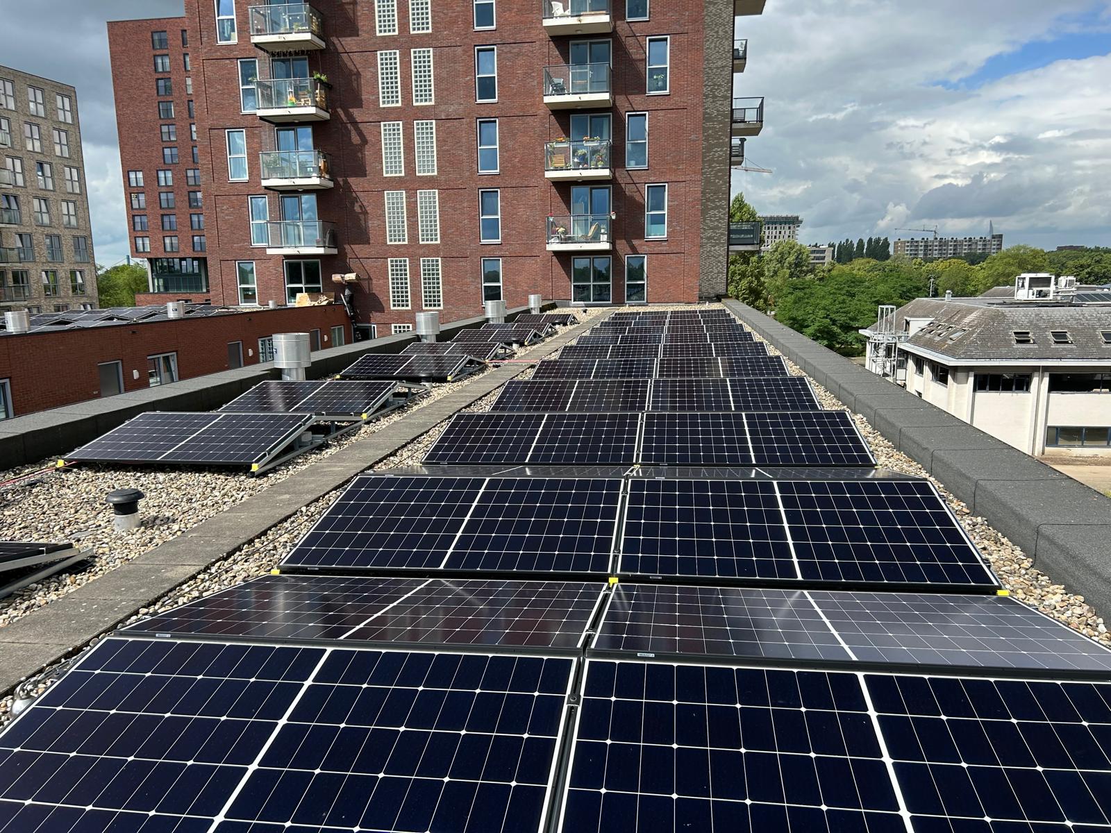 Op het dak van het appartementencomplex van de SSH aan de Dekhuyzenstraat (Utrecht-Noordoost) zijn 210 zonnepanelen geïnstalleerd.